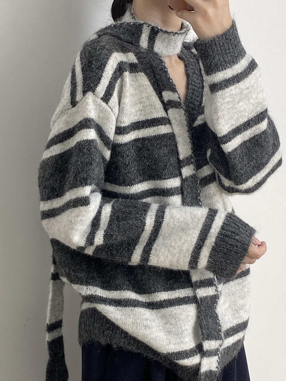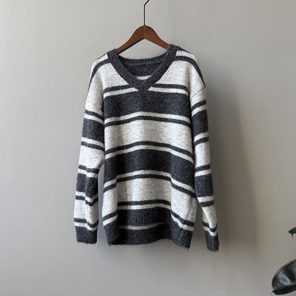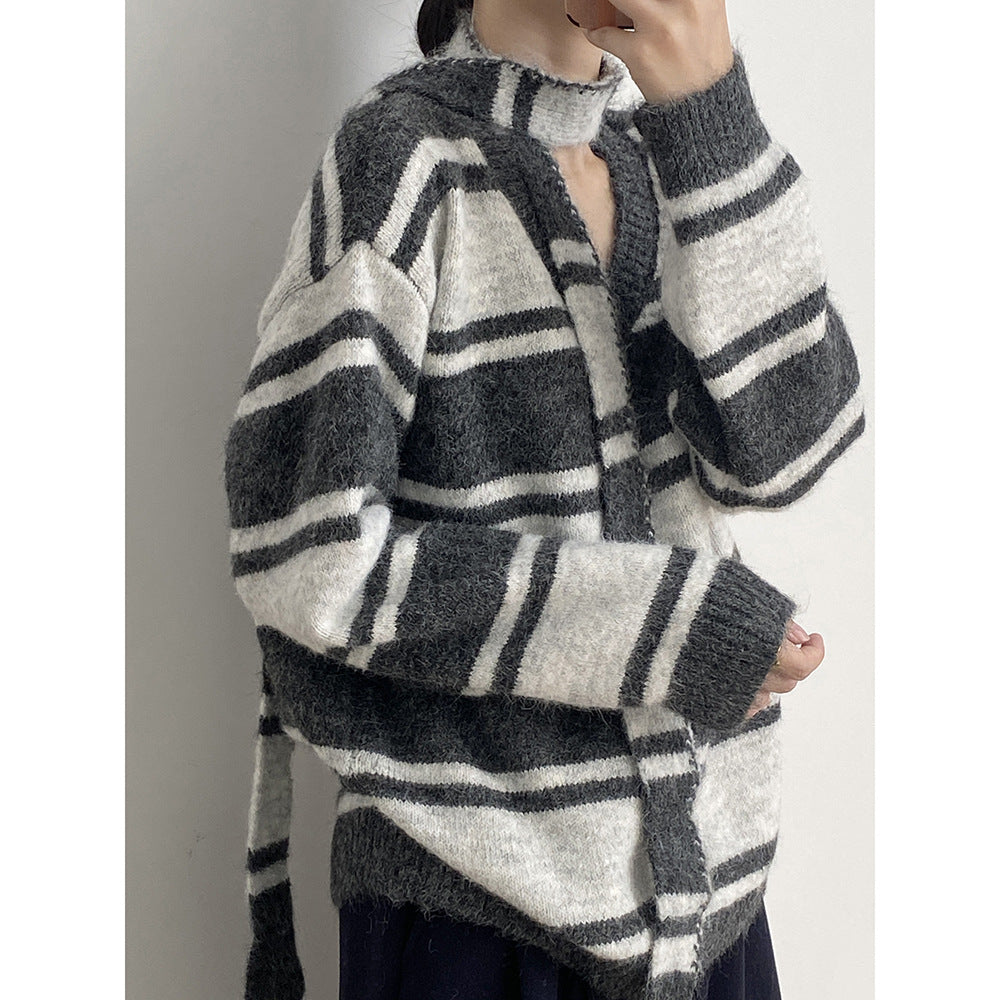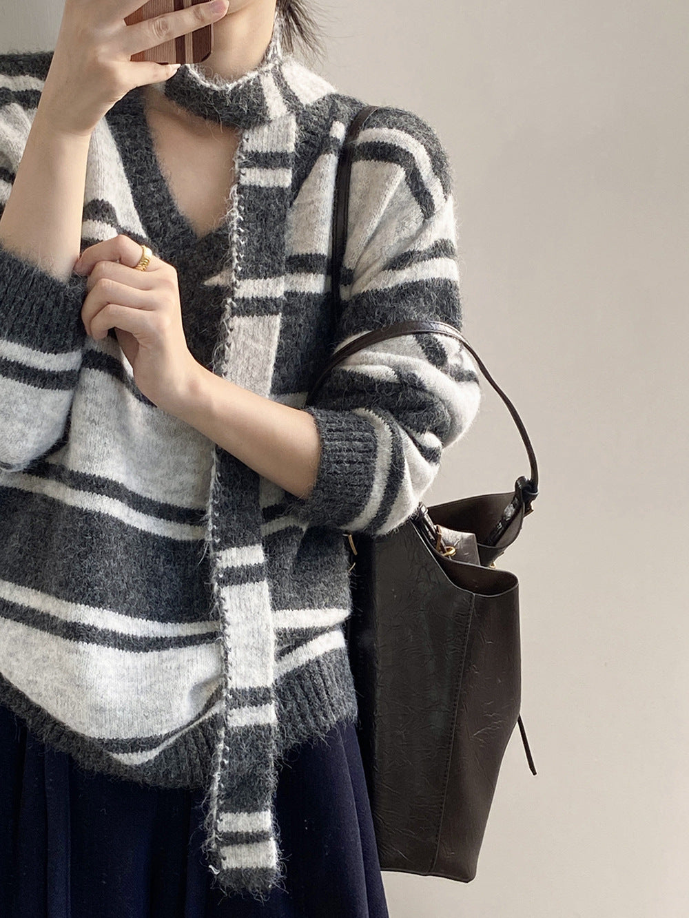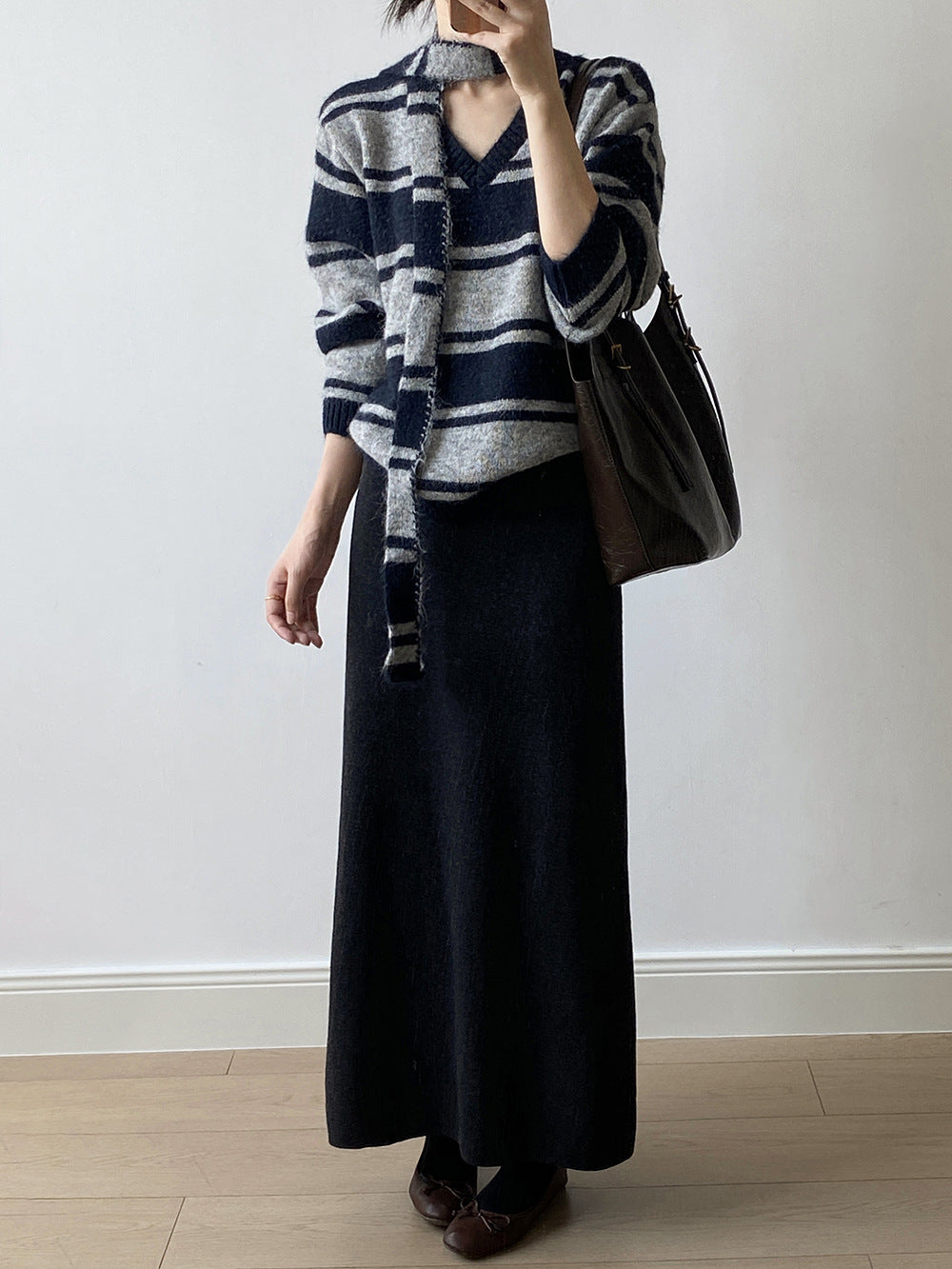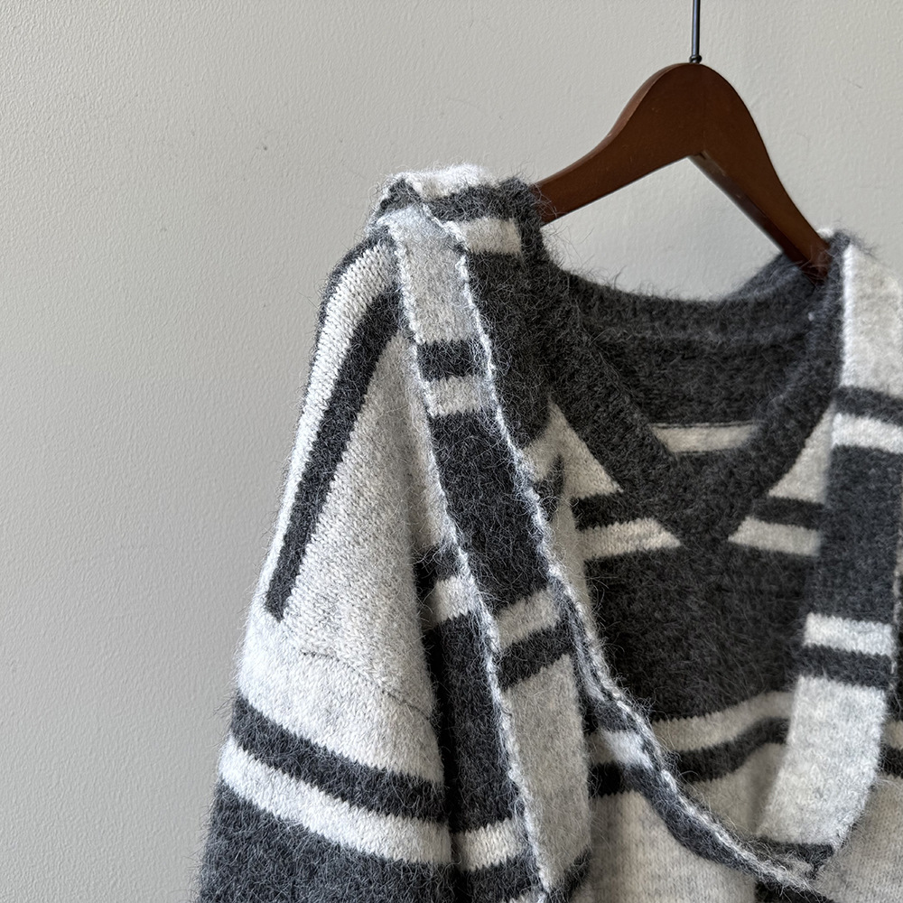 【Y25109】 實拍慵懶條紋V領毛衣+圍巾(含羊毛3%) 251023