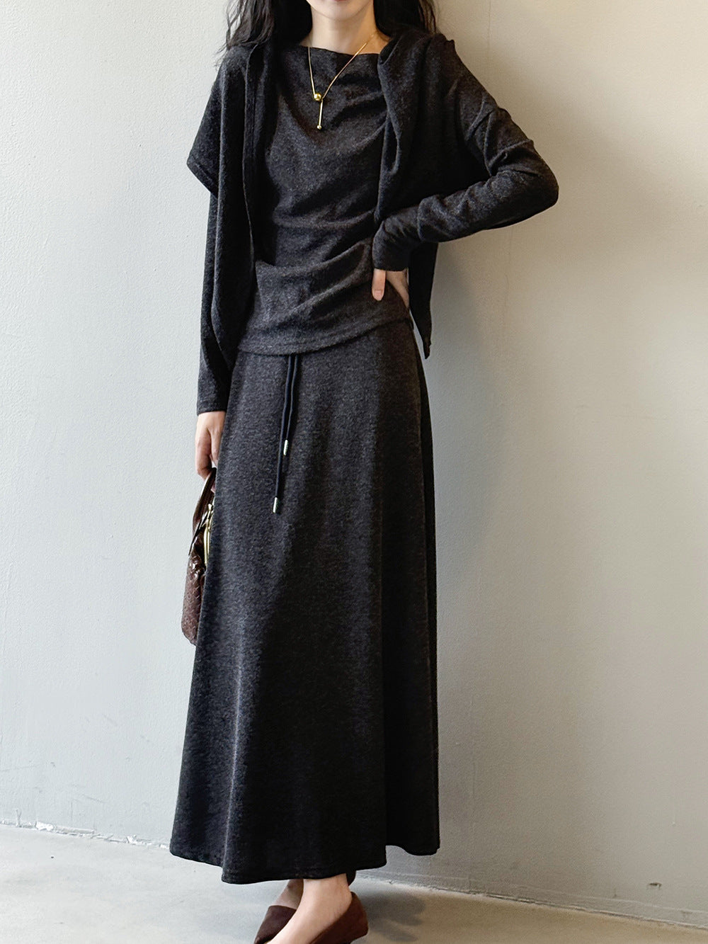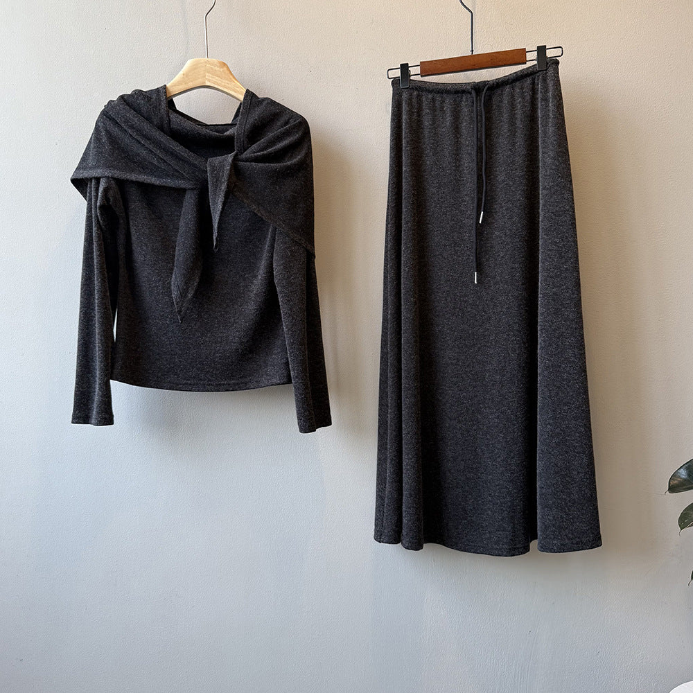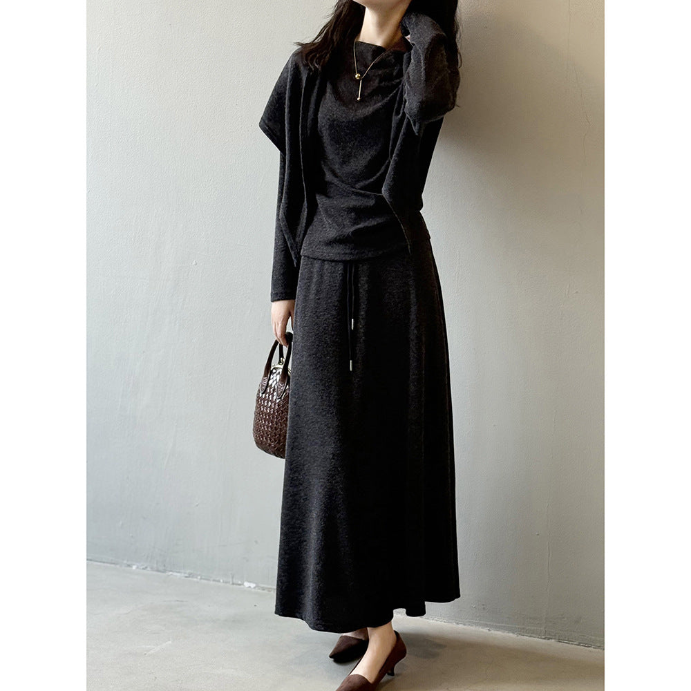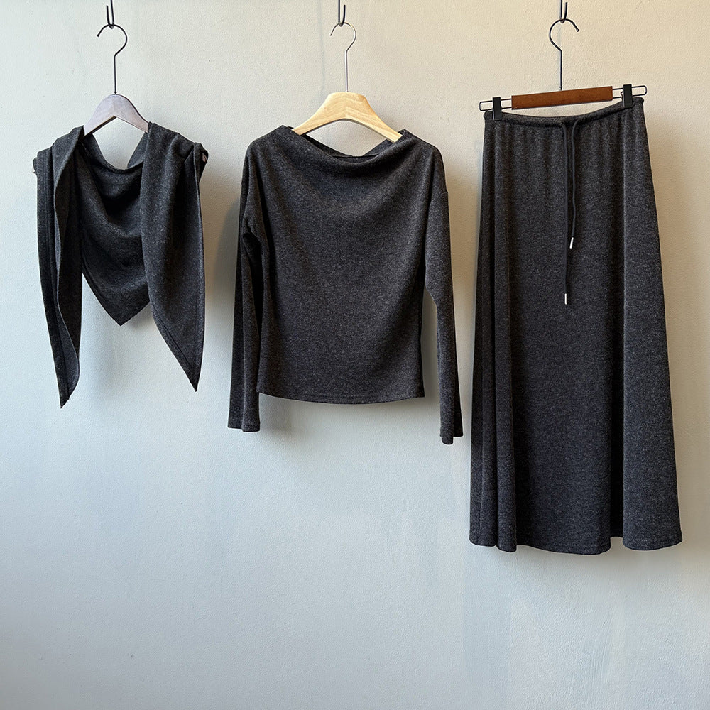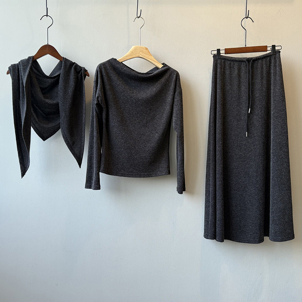 【Y79826】實拍初秋披肩針織+T恤+鬆緊腰長裙 3件套250911
