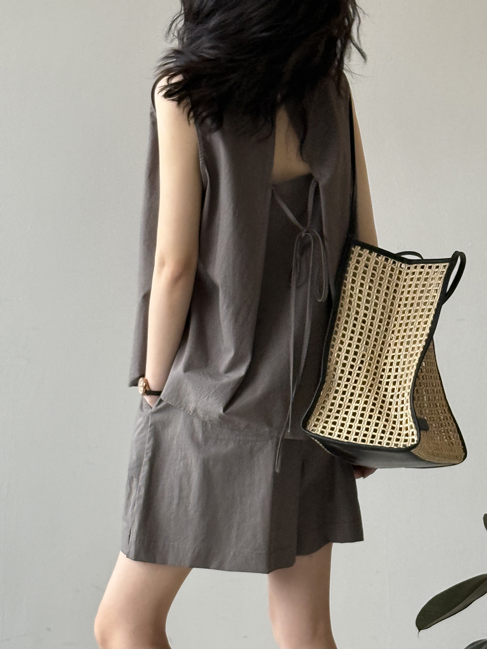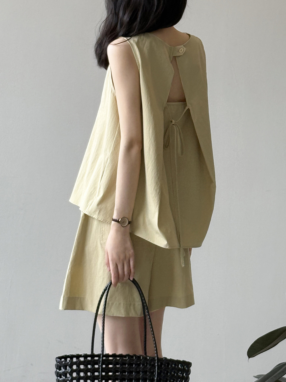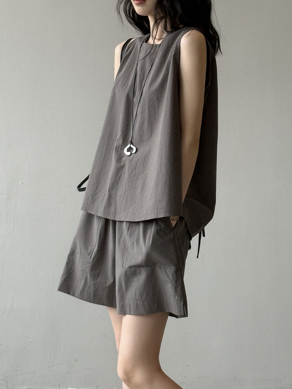 【Y8057】實拍夏日鬆弛感簡約純棉露背上衣+闊腿短褲 套裝250612