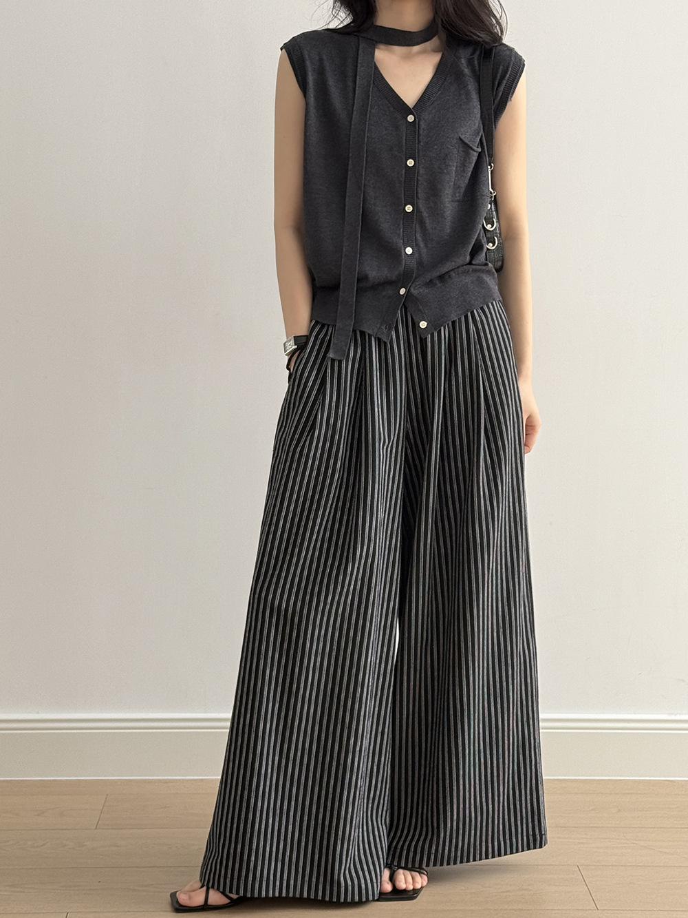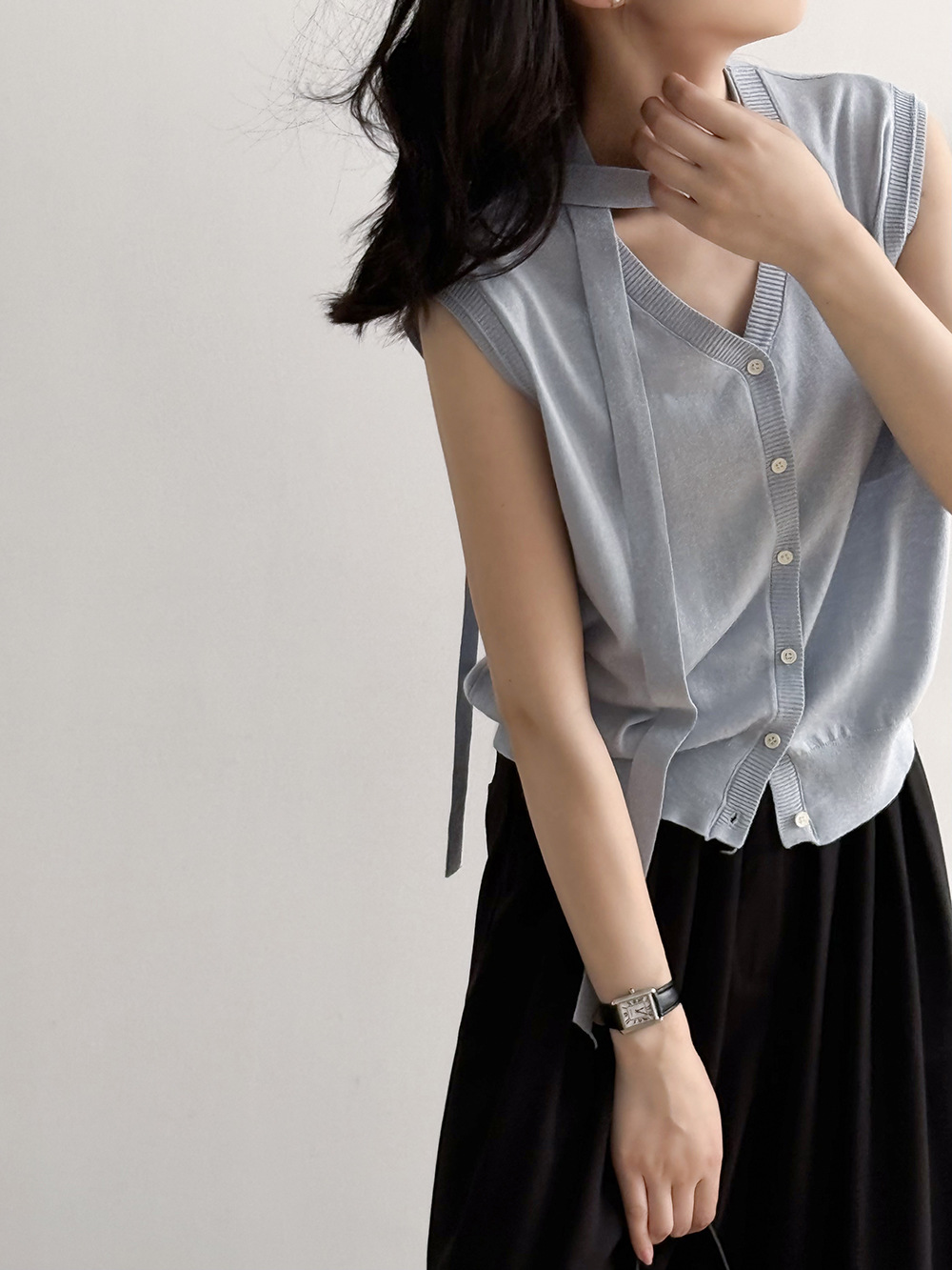 【Y82097】實拍韓國夏季簡約V領針織衫+飄帶250306