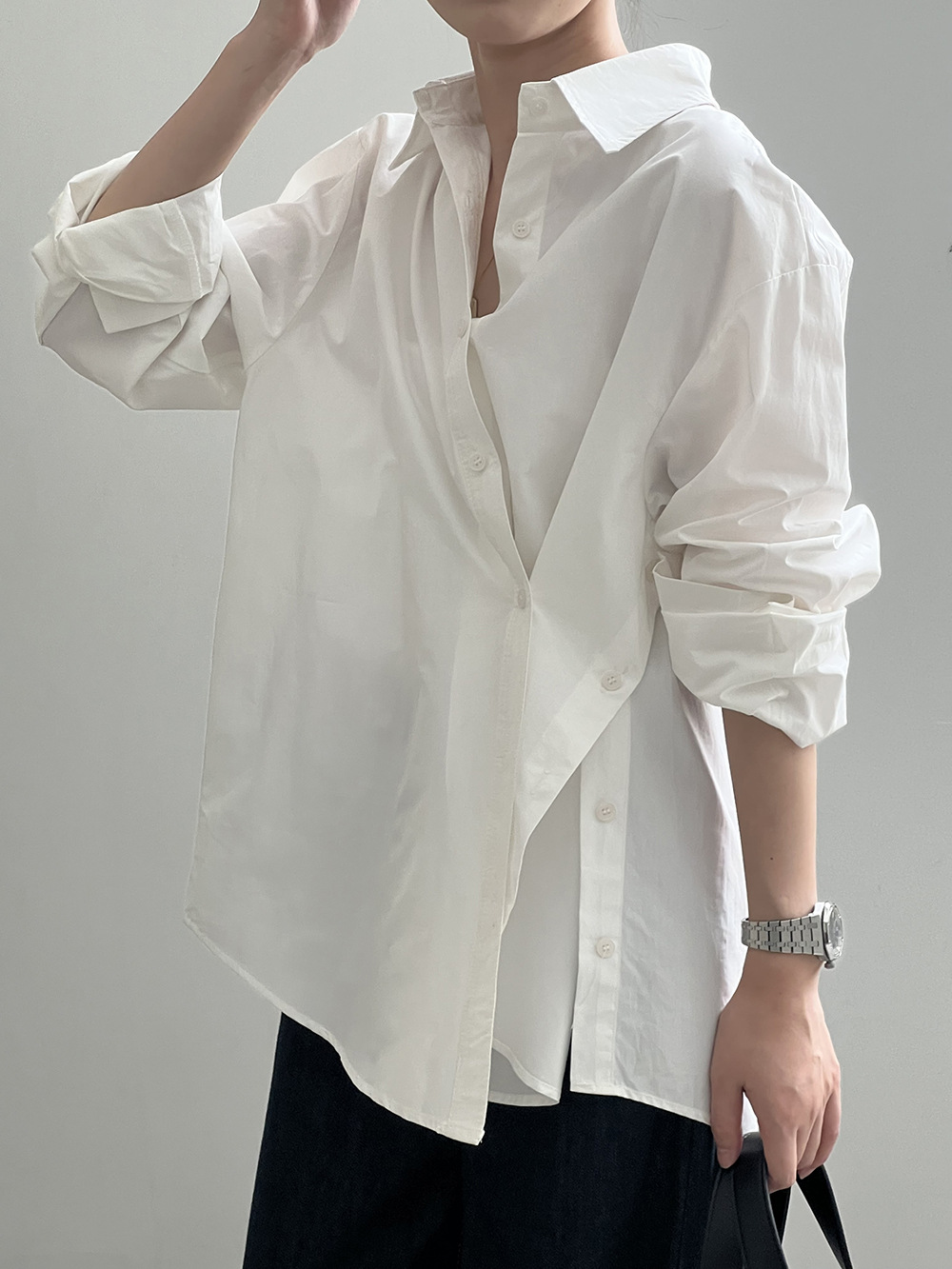 【Y82136】實拍韓國寬鬆不規則側開叉斜扣純棉襯衫YY25早春