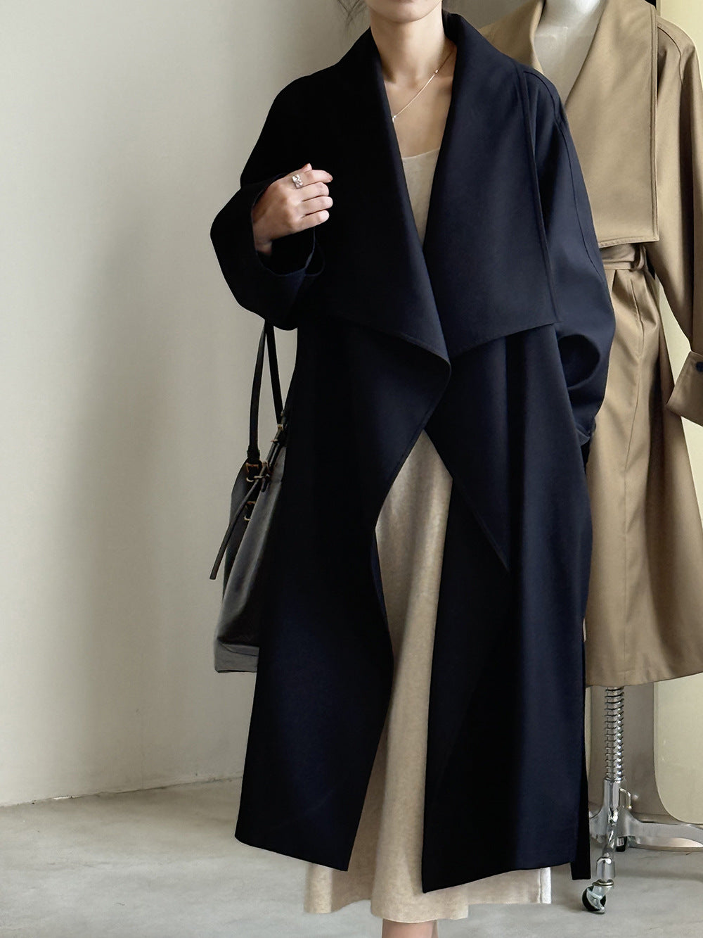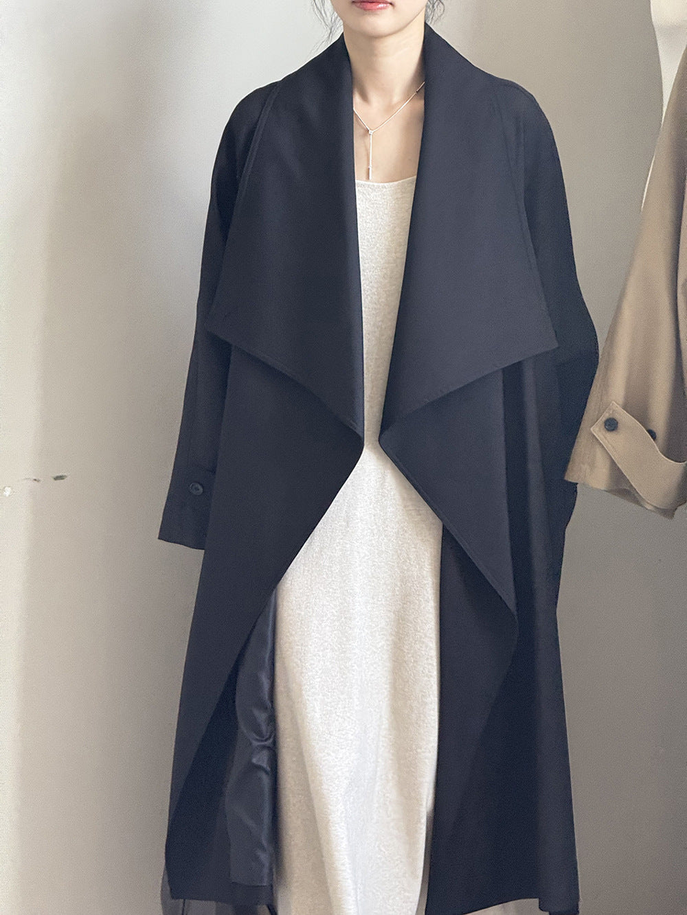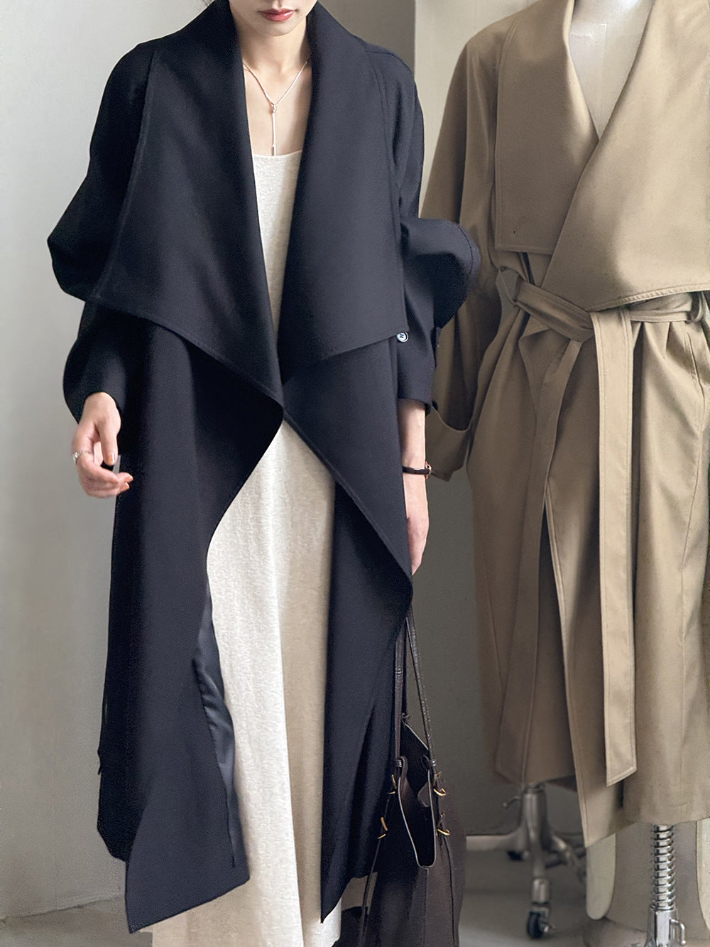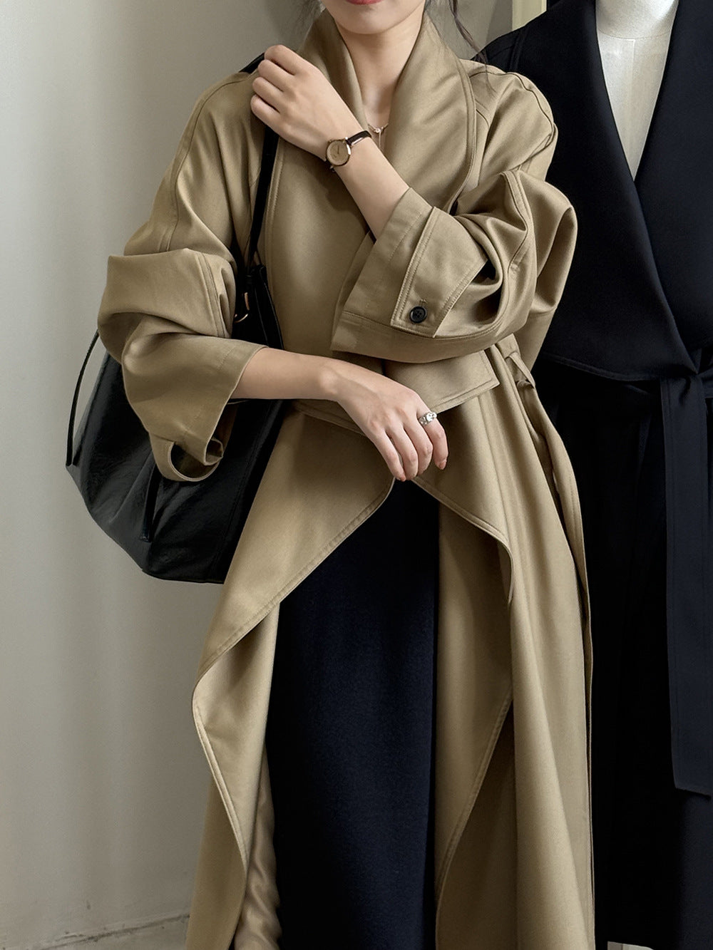 【Y82605】實拍韓系設計款大翻領寬鬆長款風衣外套含腰帶250828