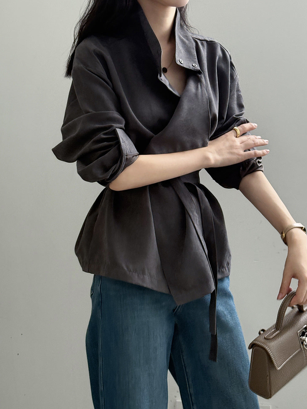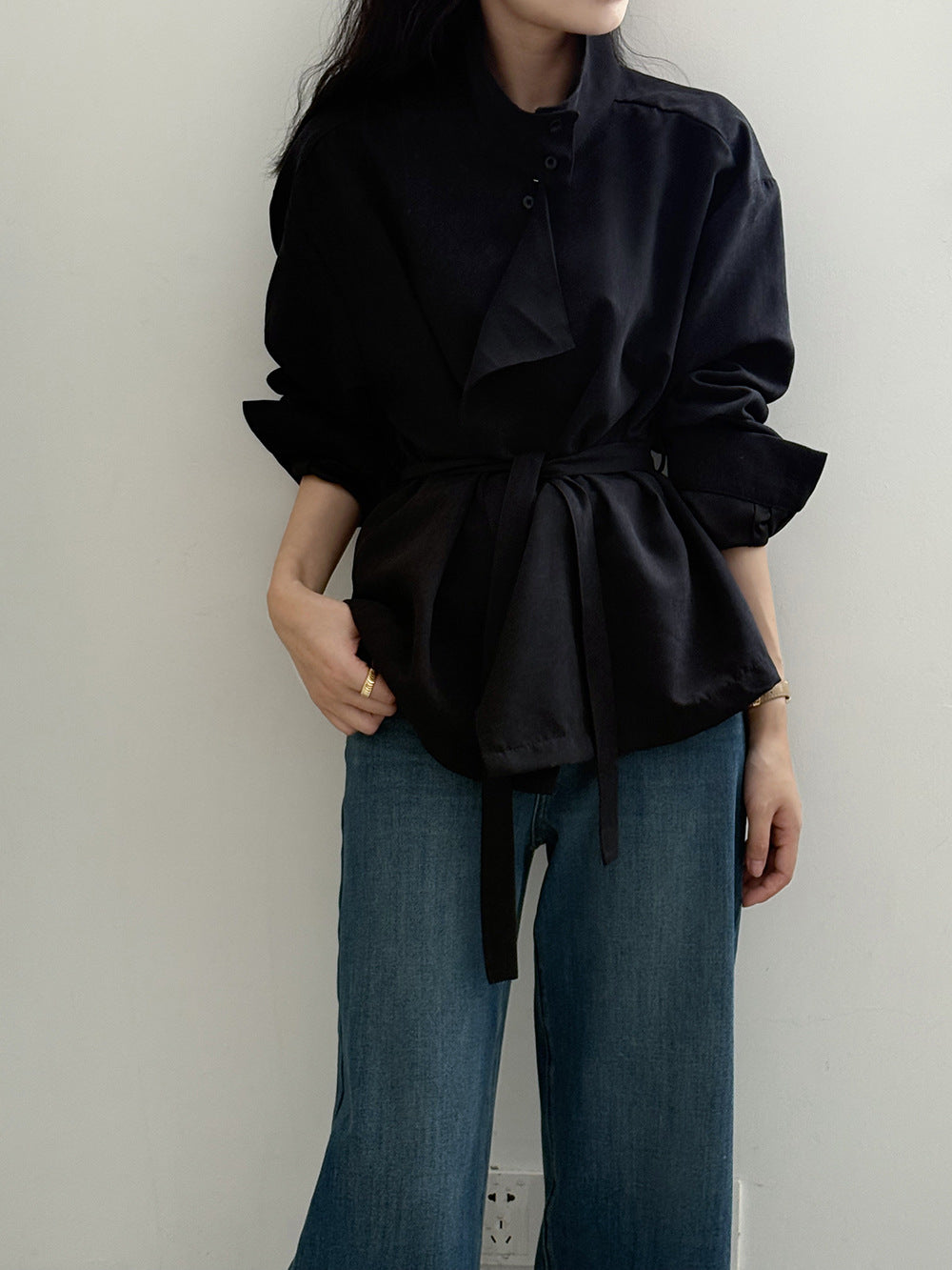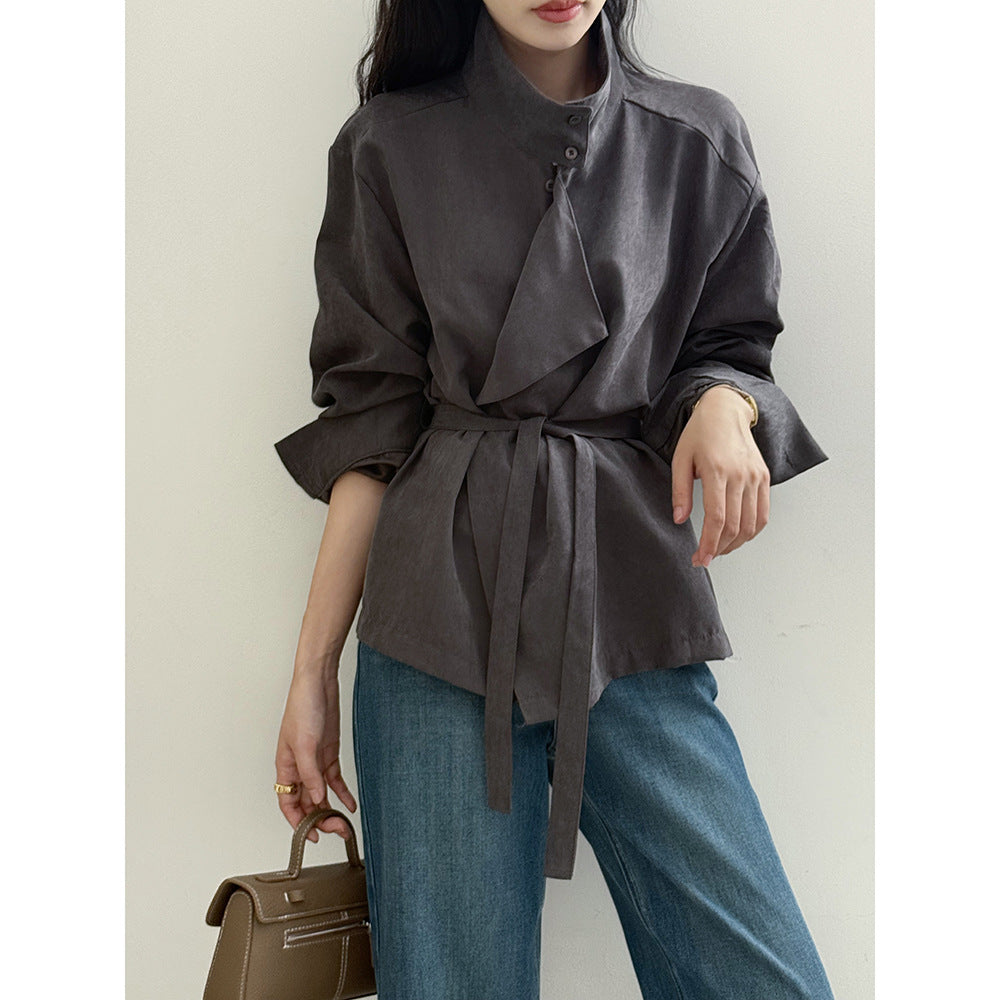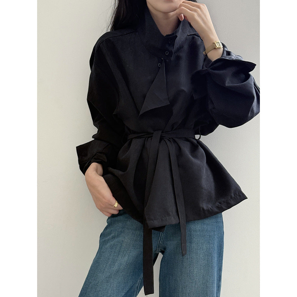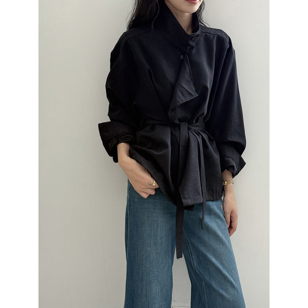【Y82622】實拍設計款絨感立領收腰繫帶襯衫250918