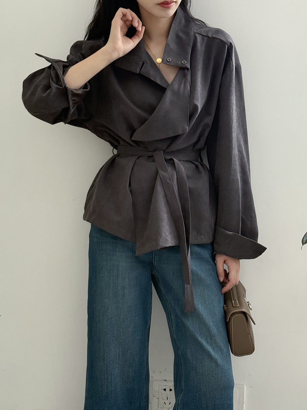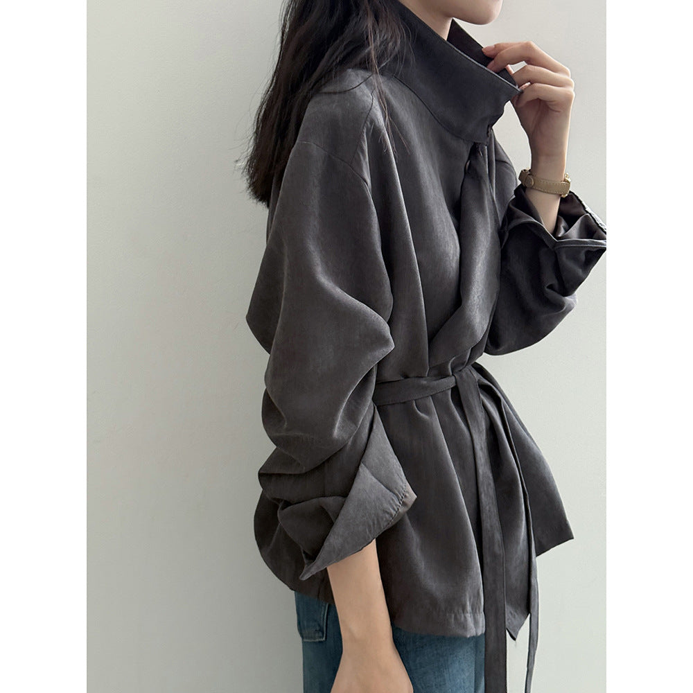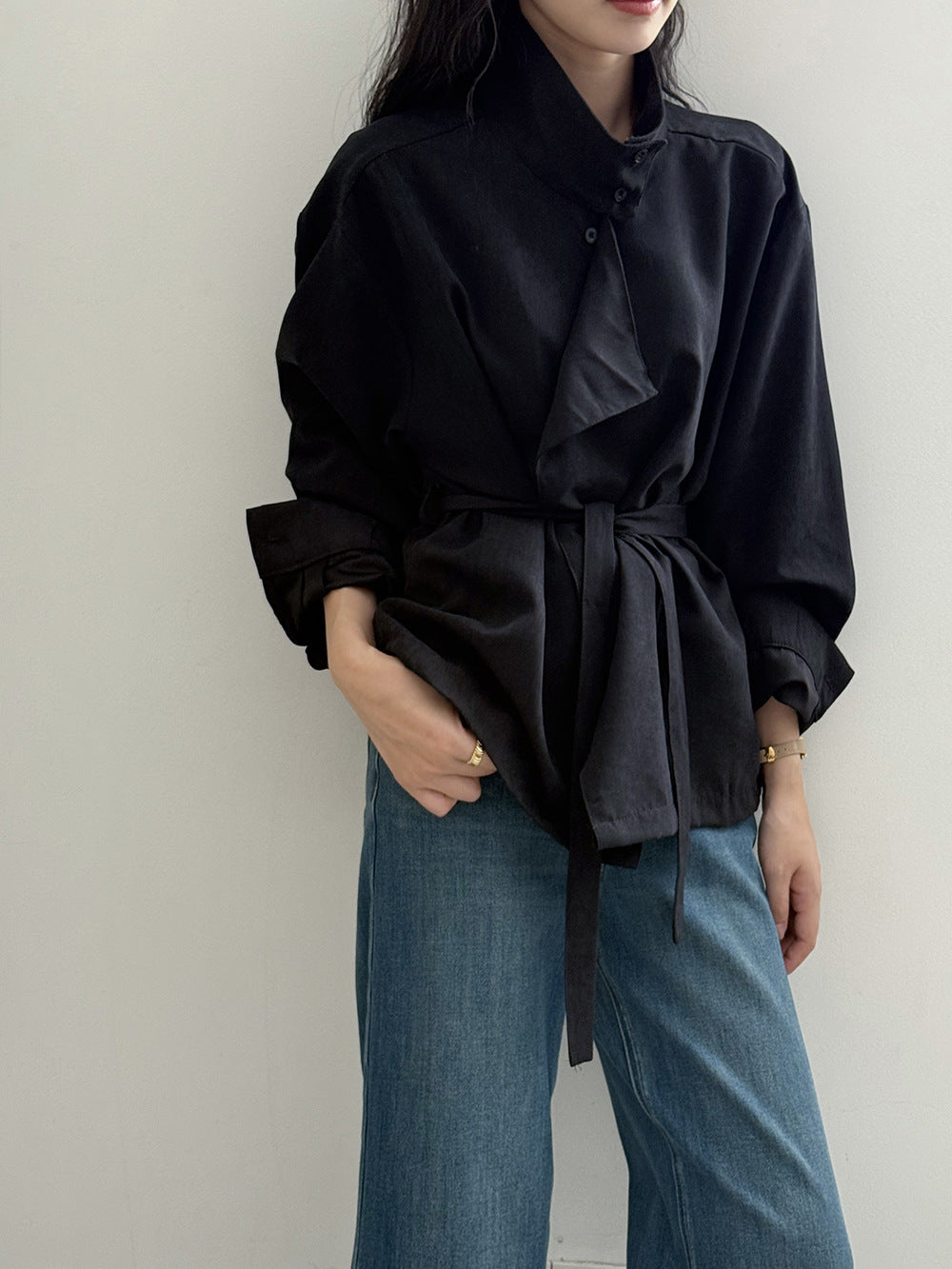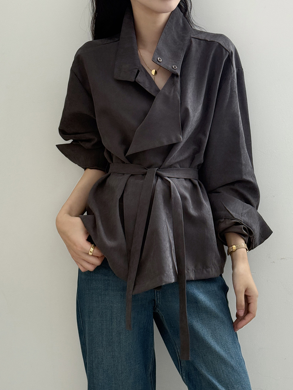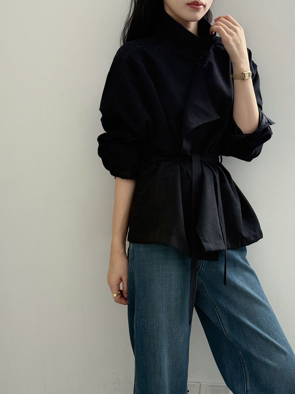 【Y82622】實拍設計款絨感立領收腰繫帶襯衫250918