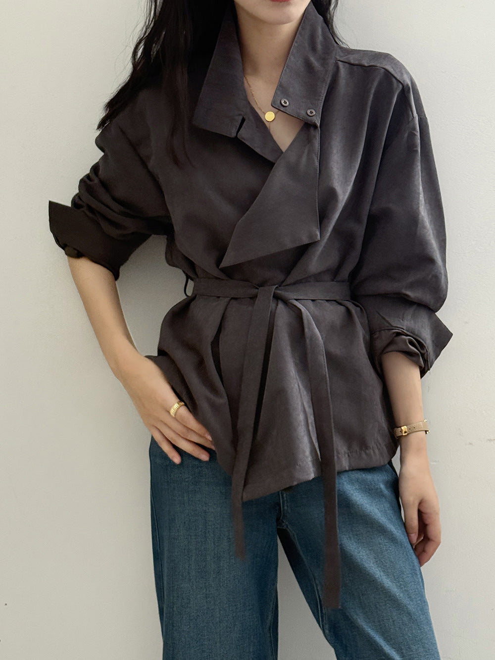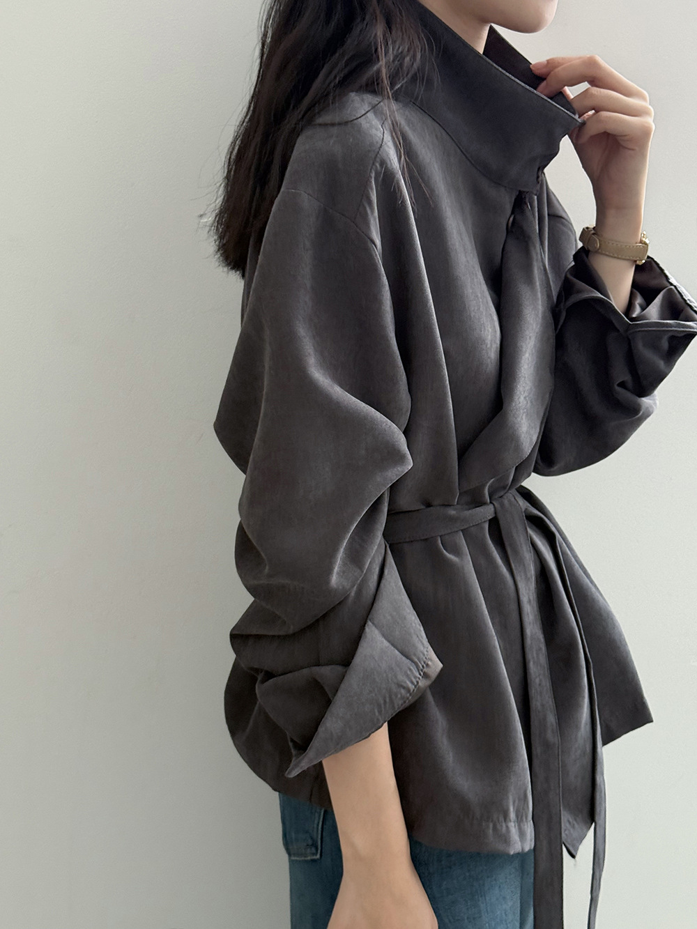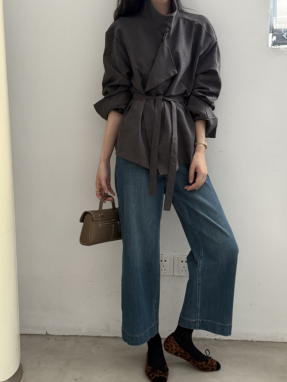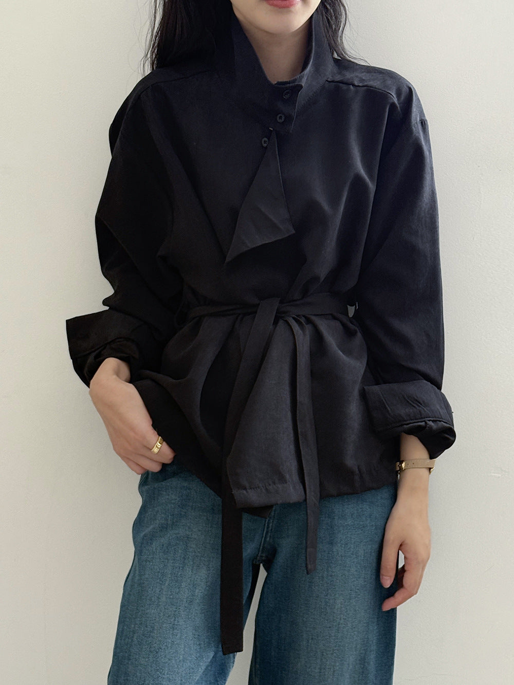 【Y82622】實拍設計款絨感立領收腰繫帶襯衫250918