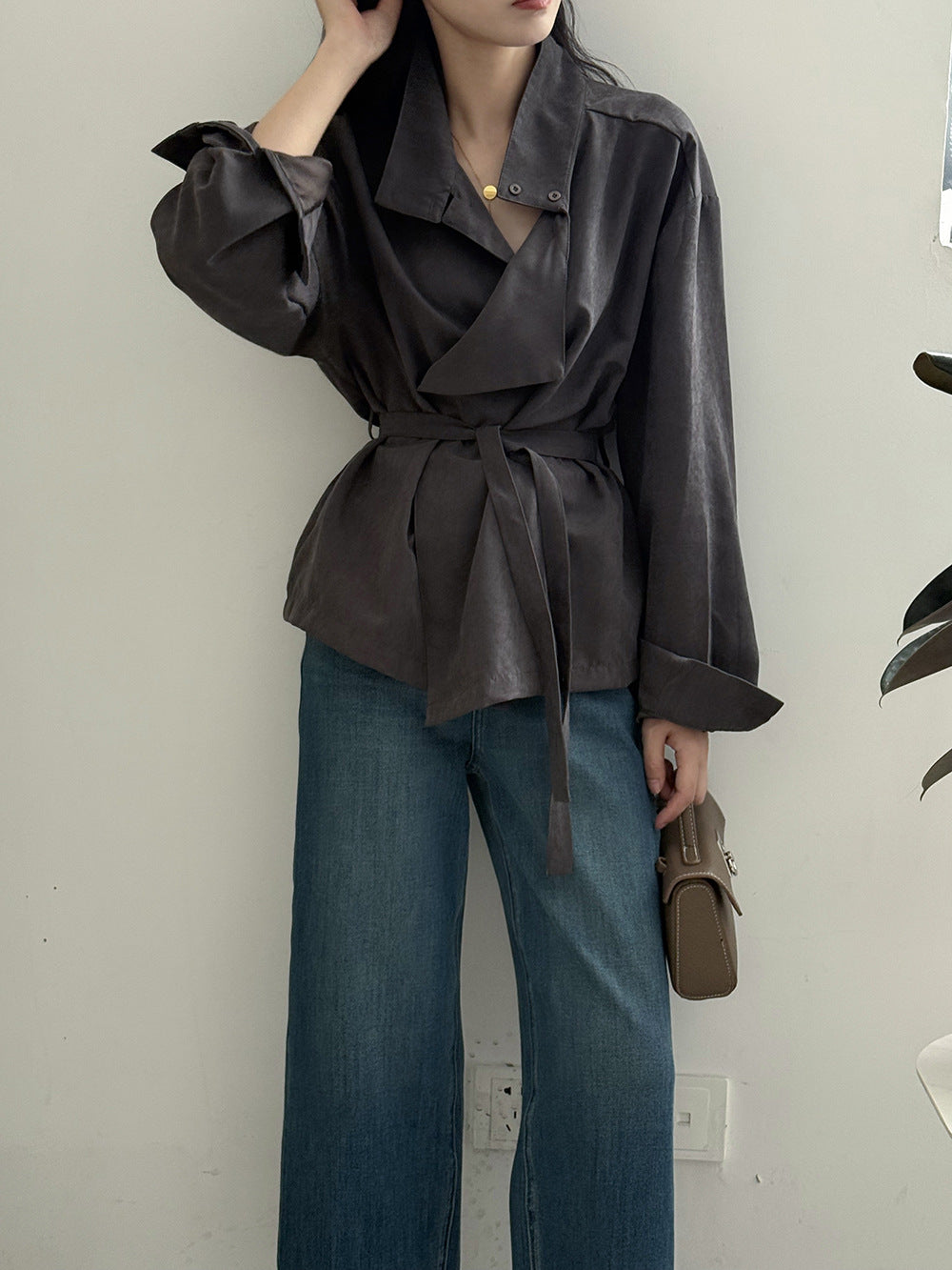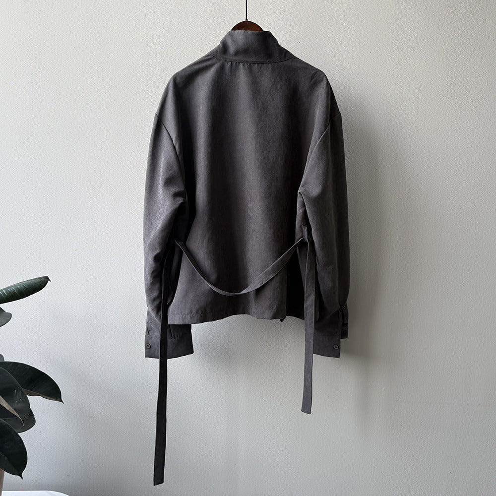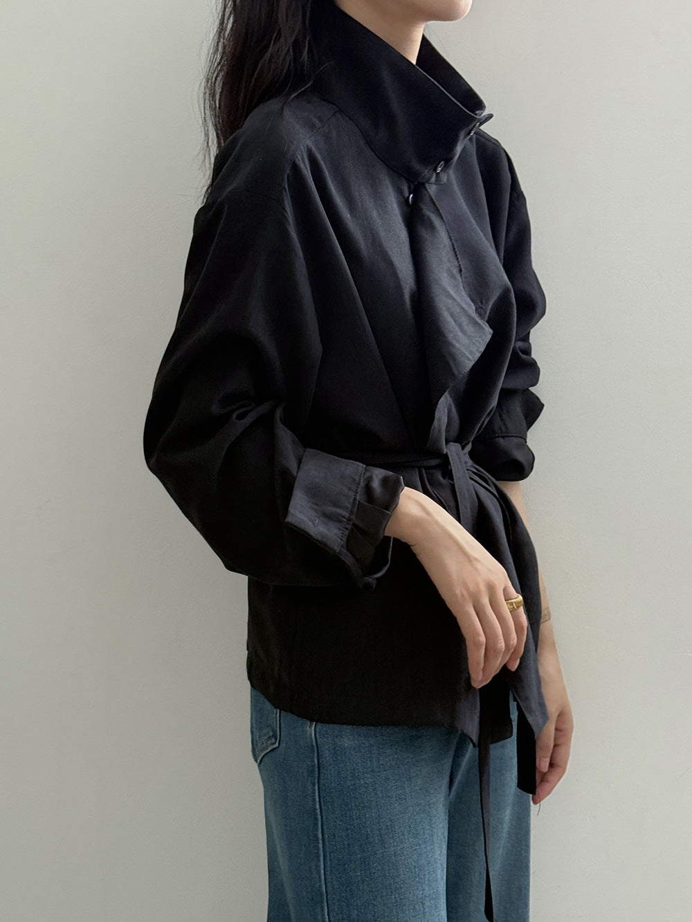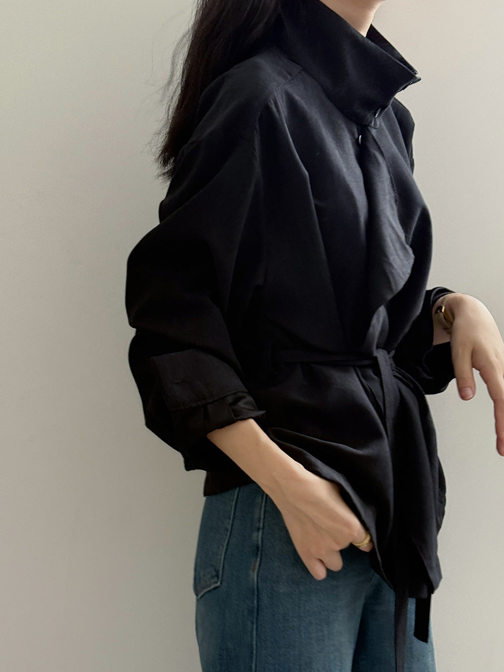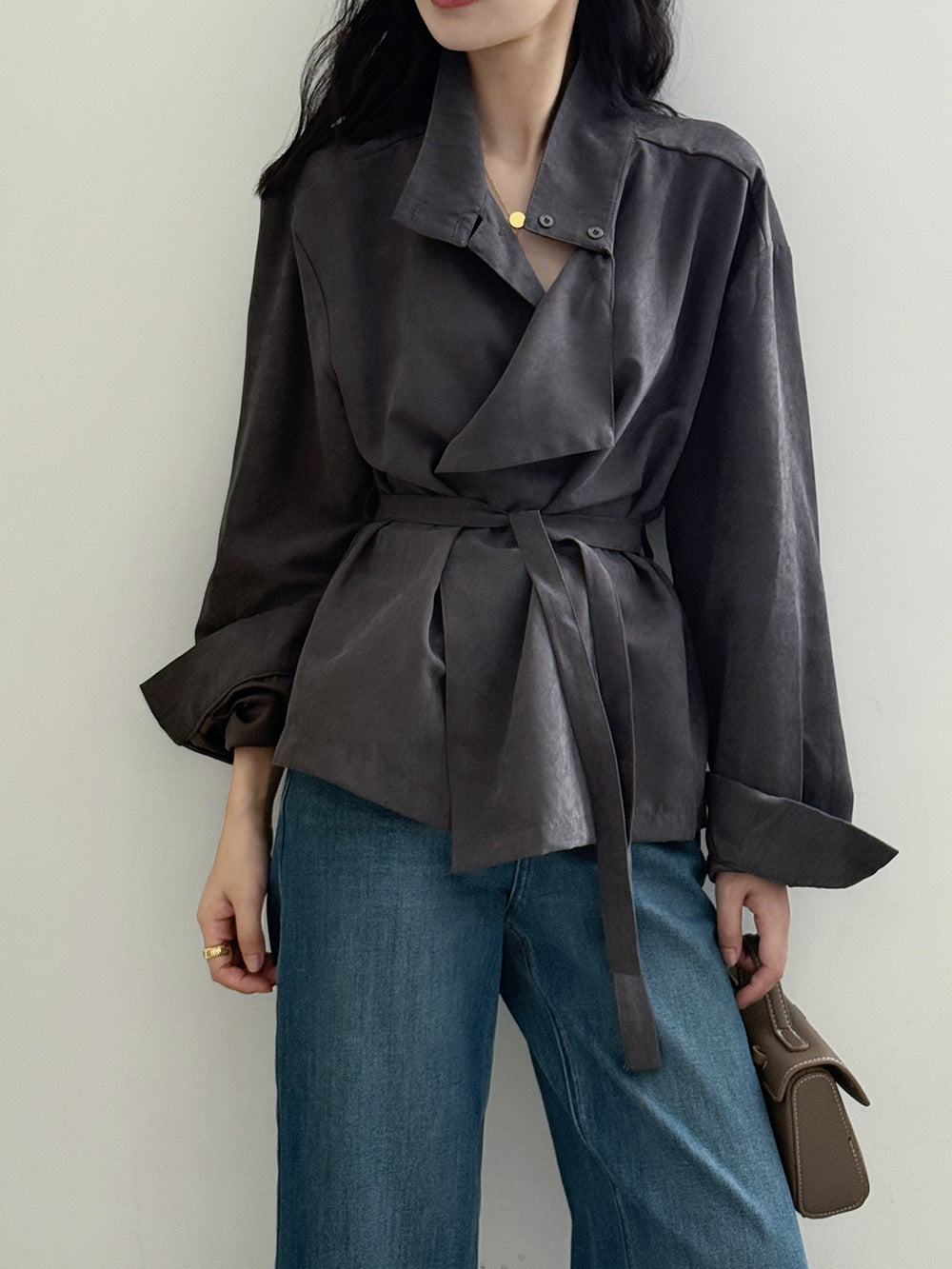 【Y82622】實拍設計款絨感立領收腰繫帶襯衫250918
