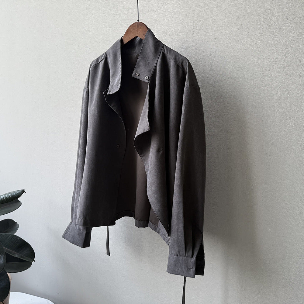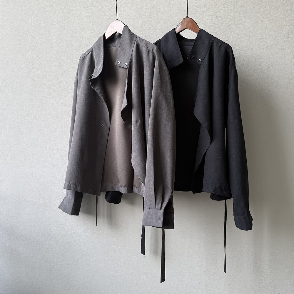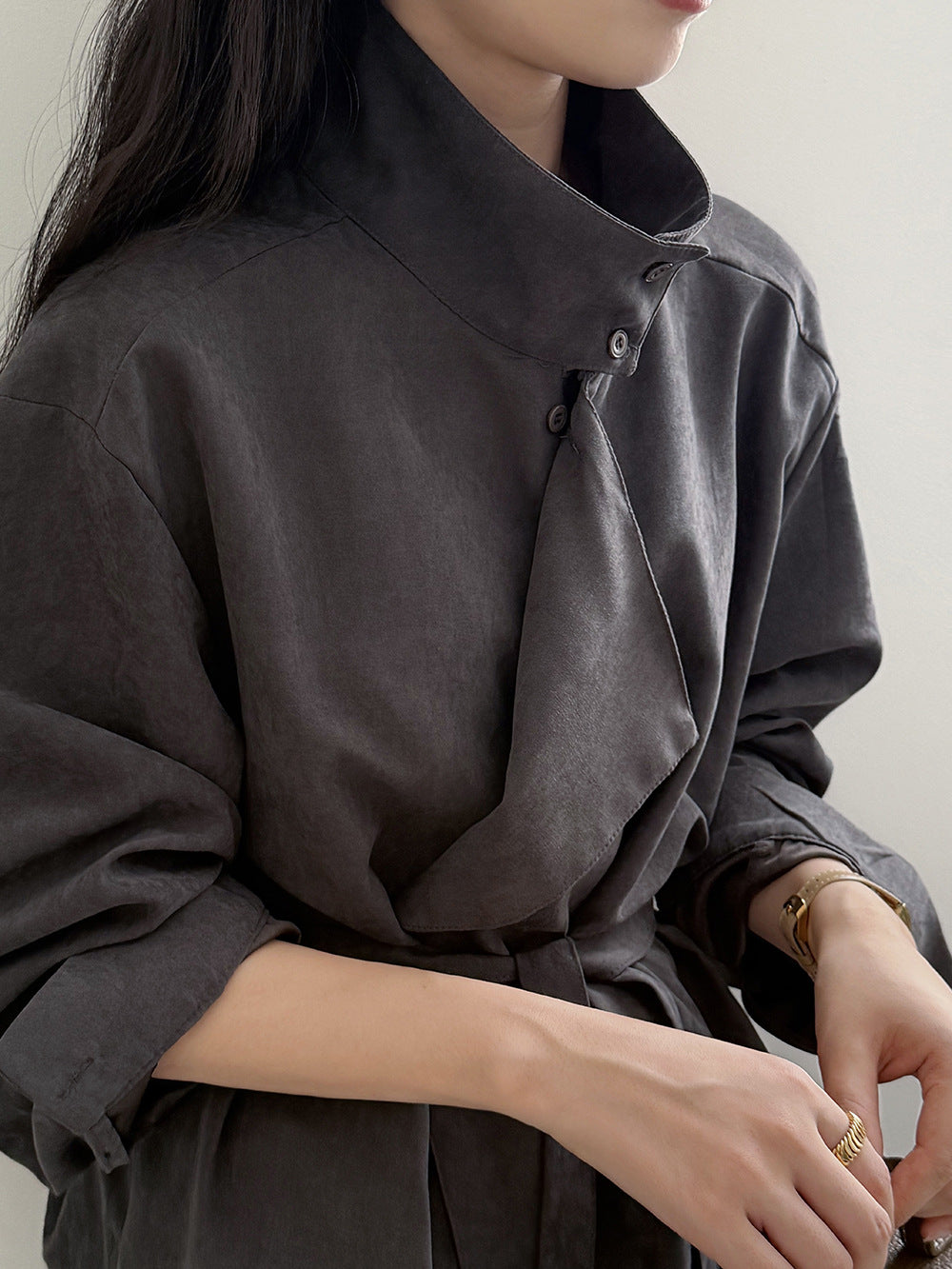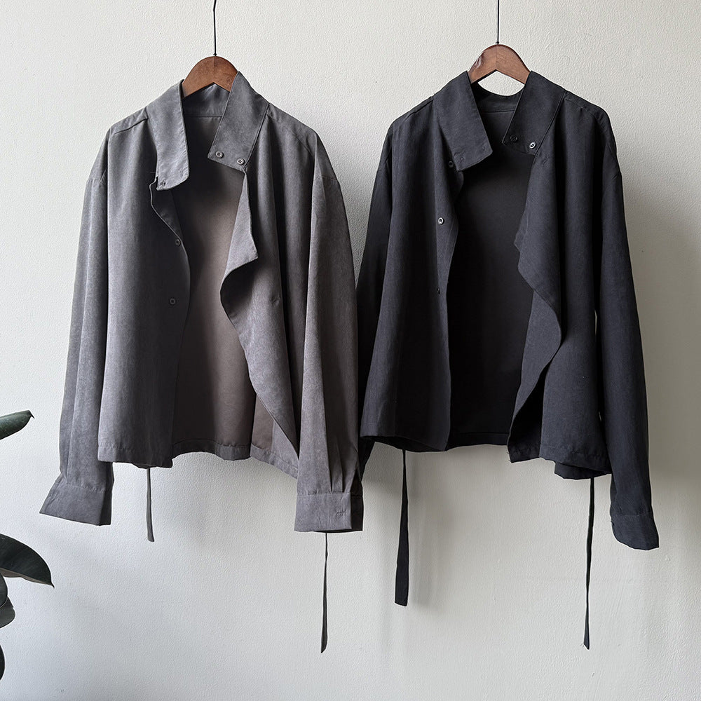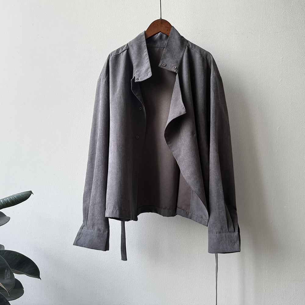 【Y82622】實拍設計款絨感立領收腰繫帶襯衫250918