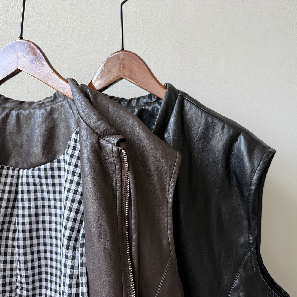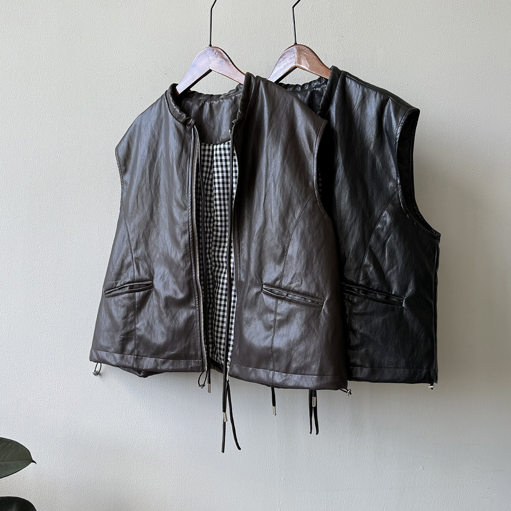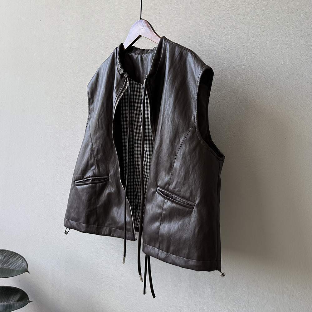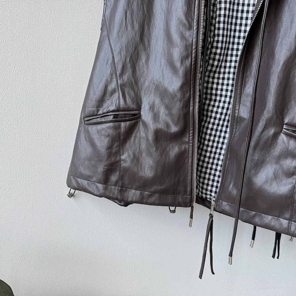 【Y9863】實拍初秋復古法式內襯格子PU皮背心250822