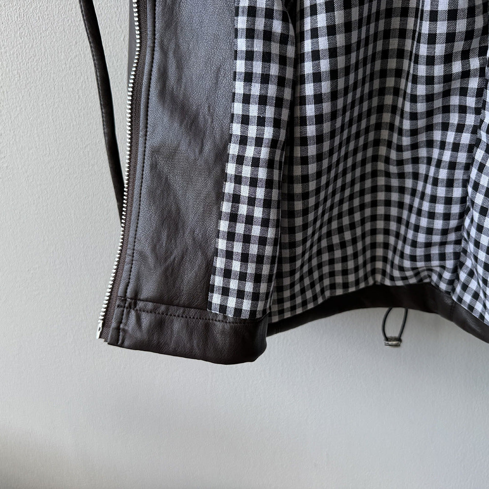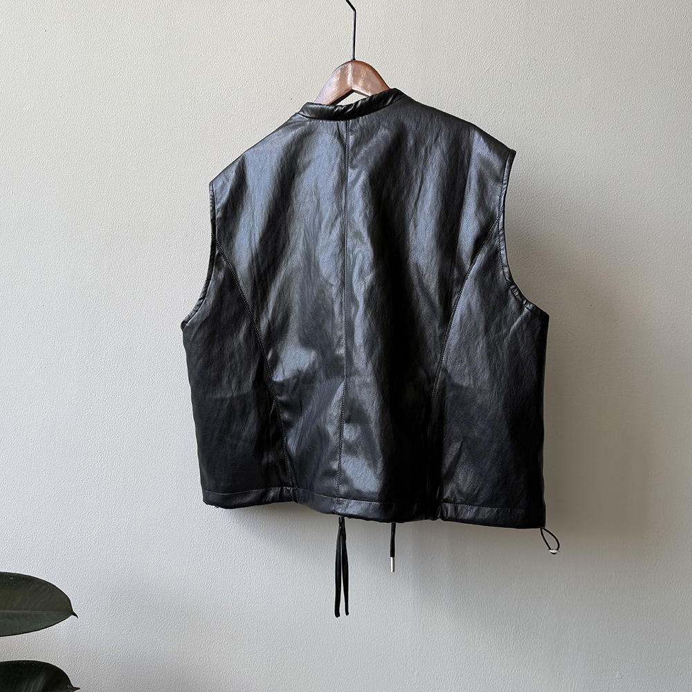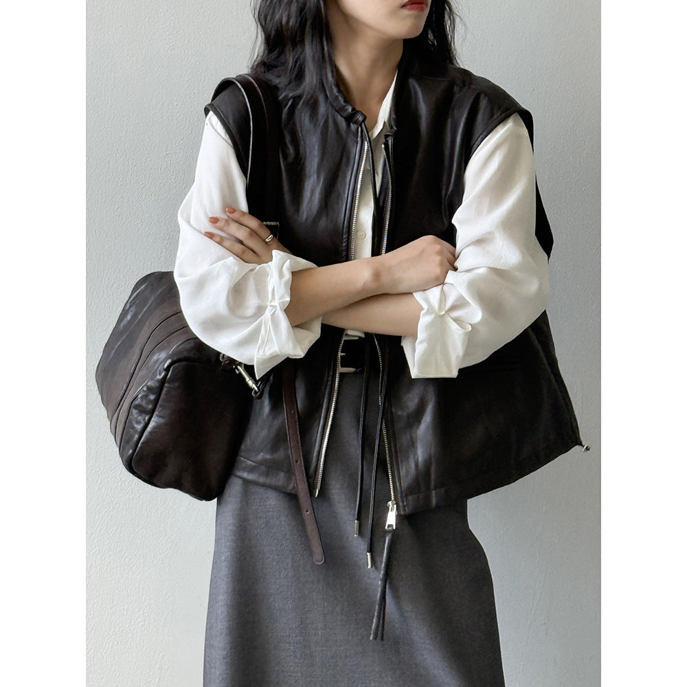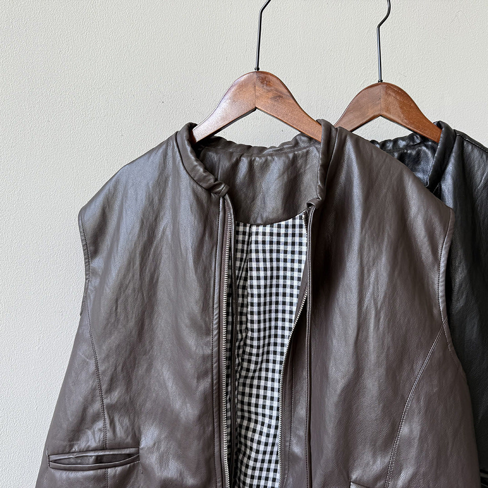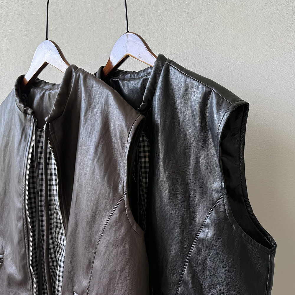 【Y9863】實拍初秋復古法式內襯格子PU皮背心250822