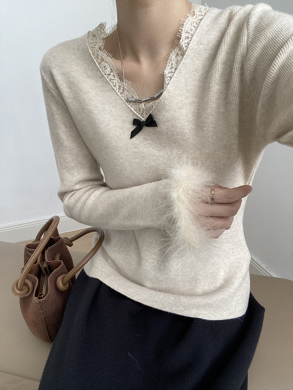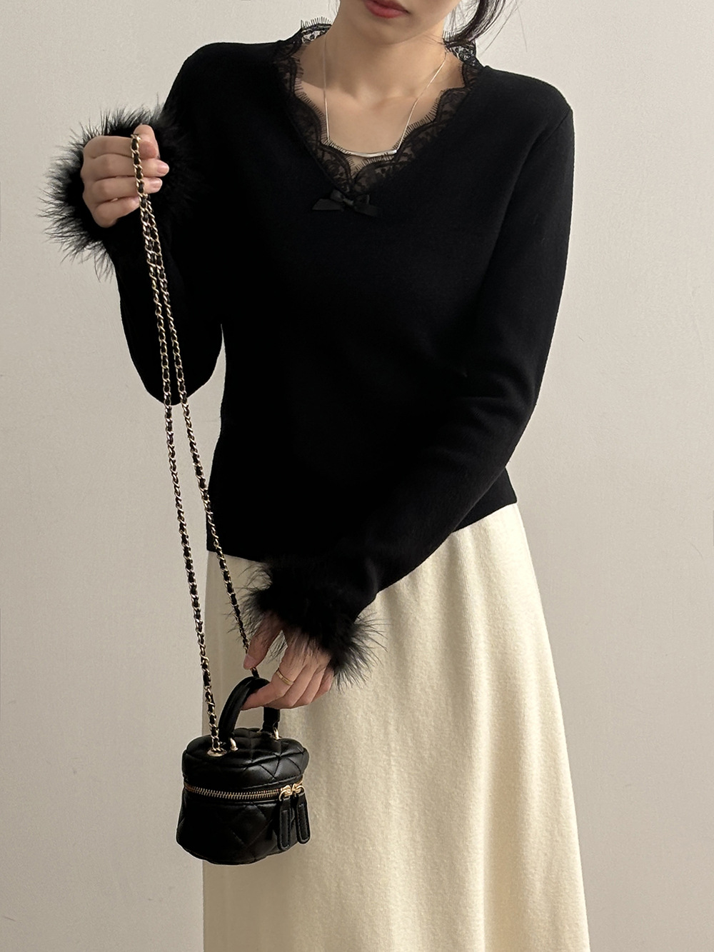 【YP1253】實拍細緻蕾絲毛毛袖口針織衫241211