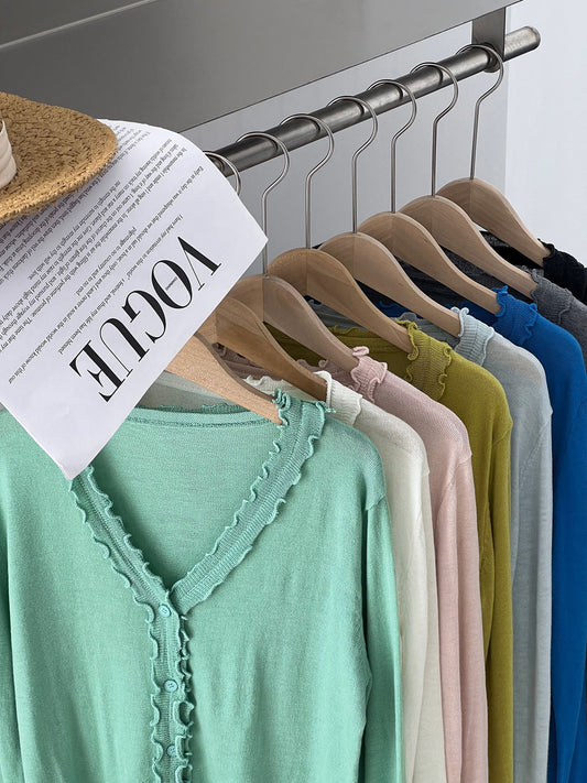 【cimz5643】韓系清新氧氣感🍃寬鬆顯瘦木耳邊V領花邊薄款針織上衣260319